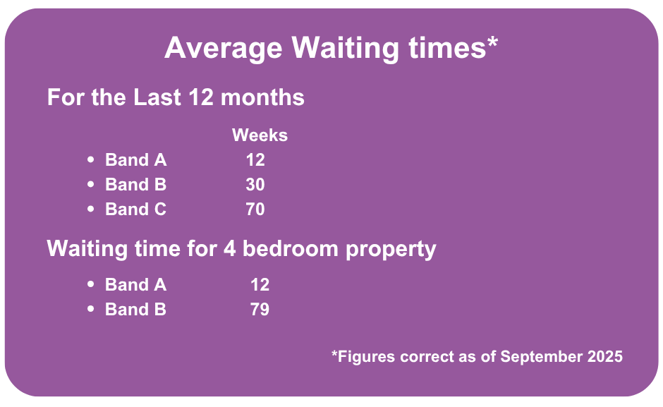 In recent years the demand for social housing has increased significantly. There are more households on the waiting list and fewer properties available. The 'Key Housing Facts' below highlight current demand and average waiting times.