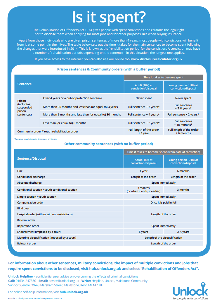 The picture below may tell you if your convictions are spent. You can also check this at Unlock.org.uk